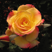 This stately rose, has golden yellow blossoms which gain a reddish-orange halo as the blossoms mature. It boasts a sweet light fragrance and was the AARS winner for 1993.(HT)
