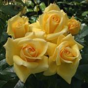 A lovely gold with a moderate rose fragrance. Average diameter 5". Large bloom form. Continuous (perpetual) bloom throughout the season. Excellent disease resistance. (HT).