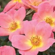 Uniquely colored coral pink blooms with yellow centers, The Rainbow Knock Out® Rose is more compact than the other members. Rarely affected by black spot. New foliage appears deep burgundy, aging to dark green.(SHR)